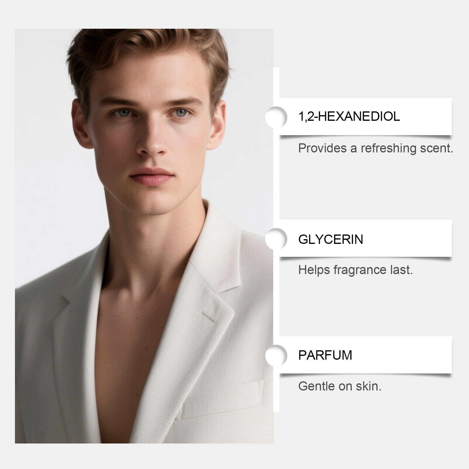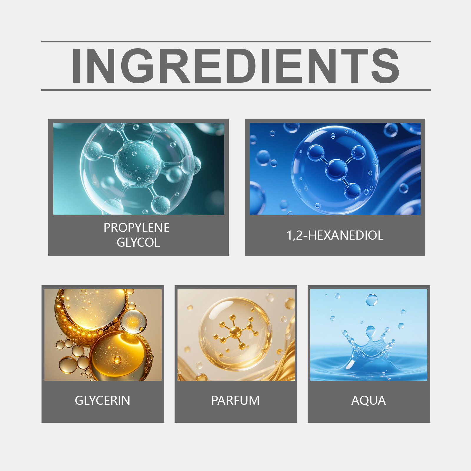 Ingredients: water, propylene glycol, glycerol, 1,2- hexanediol, essence.